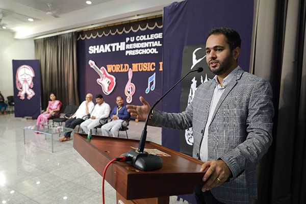 ನಂತರ ಮಕ್ಕಳನ್ನುದ್ದೇಶಿಸಿ ಮಾತನಾಡಿದ ಅವರು ಶಕ್ತಿ ಶಾಲೆಯಲ್ಲಿ ಸಂಗೀತ ದಿನಾಚರಣೆಯನ್ನು ಆಚರಿಸುತ್ತಿರುವುದಕ್ಕೆ ಅಭಿನಂದನೆಯನ್ನು ತಿಳಿಸುತ್ತೇನೆ. ದಿನದಲ್ಲಿ ಕನಿಷ್ಠ ಒಂದು ಗಂಟೆಯಾದರೂ ನಾವು ನಮ್ಮ ಹವ್ಯಾಸಗಳಿಗೆ ಮೀಸಲಿಡಬೇಕು, ಪ್ರತಿಯೊಬ್ಬರೂ ಒಂದಲ್ಲಾ ಒಂದು ರೀತಿಯ ಸಂಗೀತ ಕಲಿಯಬೇಕು, ಸಂಗೀತವು ನಮ್ಮಲ್ಲಿ ಕ್ರಿಯಾಶೀಲತೆಯನ್ನು ಹಾಗೂ ಏಕಾಗ್ರತೆಯನ್ನು ಹೆಚ್ಚಿಸುತ್ತದೆ. ನಾವು ನಮ್ಮ ಭಾರತೀಯ ಶಾಸ್ತ್ರೀಯ ಸಂಗೀತ ಶೈಲಿಯನ್ನು ಅದರ ಪ್ರಾಮುಖ್ಯತೆಯನ್ನು ಅರಿತು ಗೌರವಿಸಬೇಕು ಎಂದರು. ಭಾರತದ ಅನೇಕ ಯುವ ಸಂಗೀತಕಾರರು ಇಂದು ಭಾರತವನ್ನು ಅಂತರಾಷ್ಟ್ರೀಯ ಮಟ್ಟದಲ್ಲಿ ಪ್ರತಿನಿಧಿಸುತ್ತಿದ್ದಾರೆ. ನಮ್ಮ ದೇಶದ ಸಂಗೀತಕ್ಕೆ ಜಗತ್ತಿನಲ್ಲಿ ಮನ್ನನೆಯಿದೆ. ಜಗತ್ತಿನ ಬೇರೆ ಬೇರೆ ದೇಶದಲ್ಲಿ ಭಾರತೀಯ ಶಾಸ್ತ್ರೀಯ ಸಂಗೀತ ಅಲಿಸುವ ಜನರು ದೊಡ್ಡ ಪ್ರಮಾಣದಲ್ಲಿ ಸಂಗೀತ ಕಚೇರಿಯನ್ನು ಆಯೋಜಿಸಿದಾಗ ಸೇರುತ್ತಾರೆ. ಆದರೆ ಇಂದು ಭಾರತದಲ್ಲಿ ಆ ಸಂಖ್ಯೆ ಕಡಿಮೆಯಾಗುತ್ತಿರುವುದು ಸ್ವಲ್ಪ ನೋವನ್ನು ಕೊಡುತ್ತಿದೆ. ನಾವು ನಮ್ಮ ಶಾಲಾ ಹಂತದಲ್ಲಿ ಸಮಯವನ್ನು ಹೊಂದಾಣಿಕೆ ಮಾಡಿ ಸಂಗೀತಕ್ಕೆ ಒತ್ತು ಕೊಡಬೇಕೆಂದು ವಿದ್ಯಾರ್ಥಿಗಳಿಗೆ ಕಿವಿ ಮಾತು ಹೇಳಿದರು.